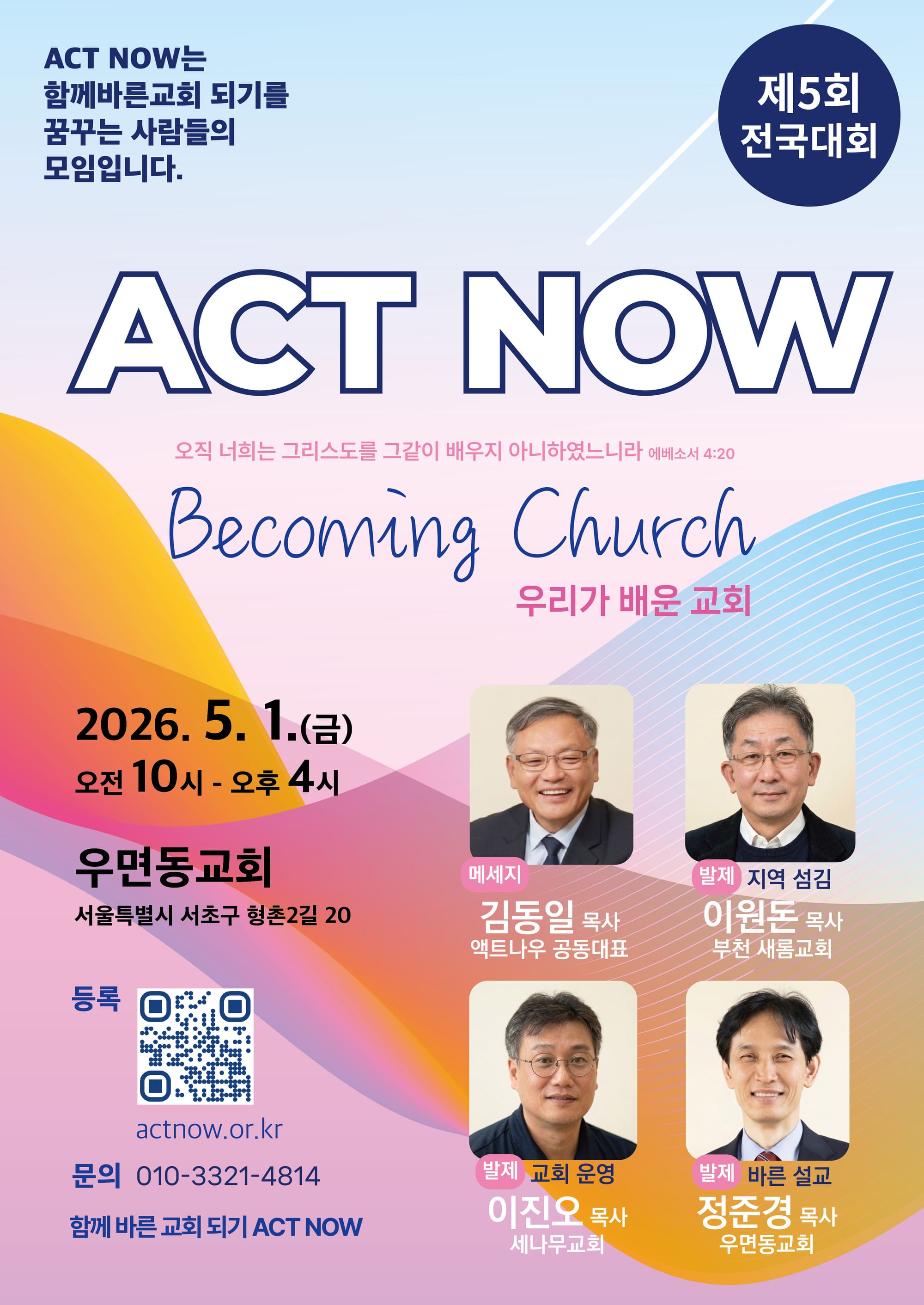 함께 바른 교회 되기를 꿈꾸는 목회자·성도들의 모임 액트나우(ACT NOW)가 오는 5월 1일(금), 서울 서초구 우면동교회에서 제5회 액트나우 전국대회를 개최한다.